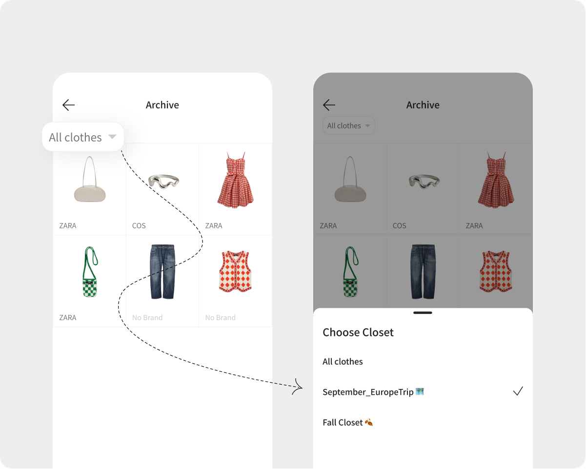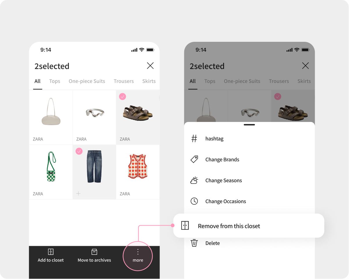 On the closet detail page, you can select multiple items to remove from the closet at once