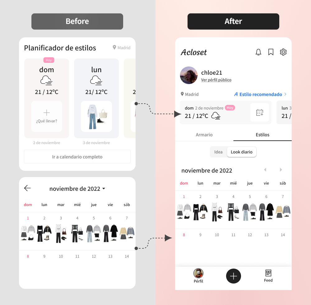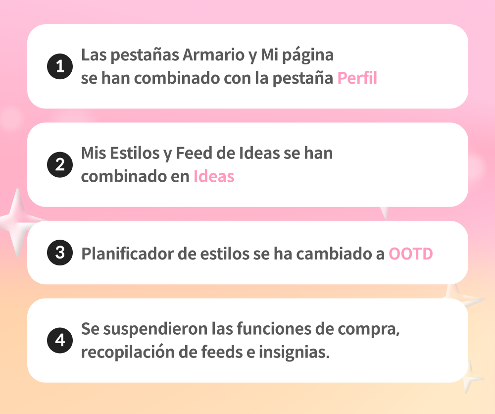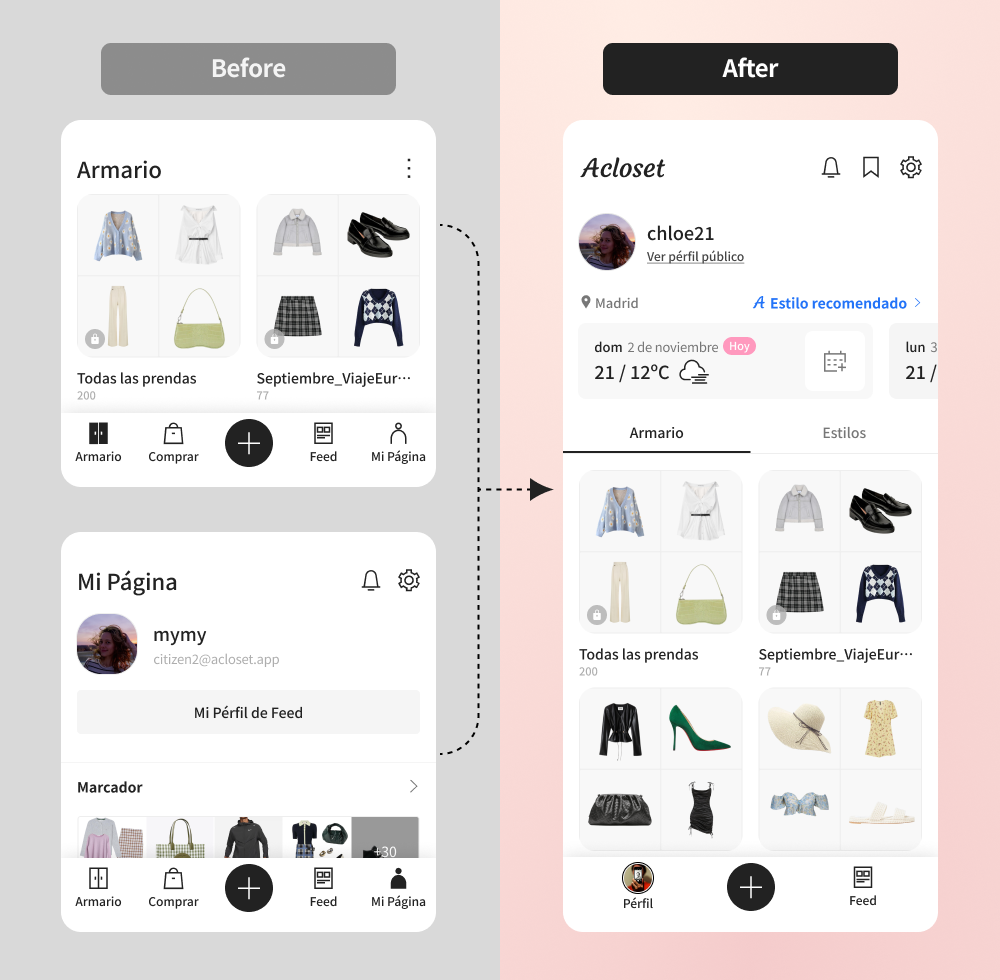 1 Las pestañas Armario y Mi página se han combinado con la pestaña Perfil