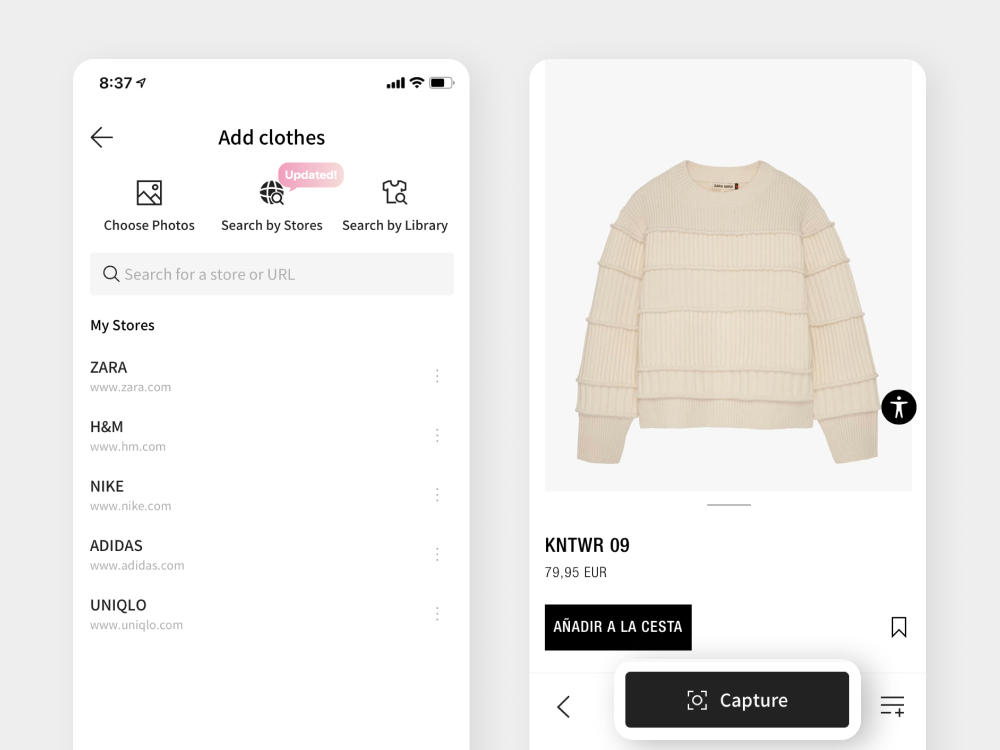 Browse the store that carries the item you bought on the Add Clothes page. You can take clean snapshots of any itemin the store and add it to your closet.