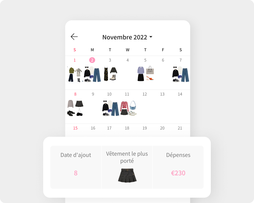 Consultez vos statistiques mensuelles sur votre calendrier, y compris les vêtements les plus portés du mois