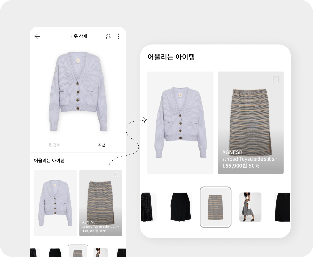 내 옷 상세 페이지 추천 탭에서 이 옷과 어울리는 상품을 살펴보세요