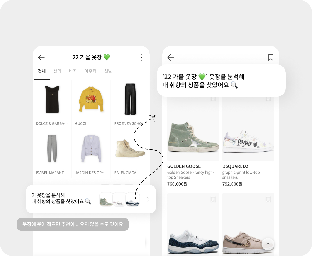 각 옷장 페이지에서 옷장을 분석해 내 취향의 상품을 추천해드려요