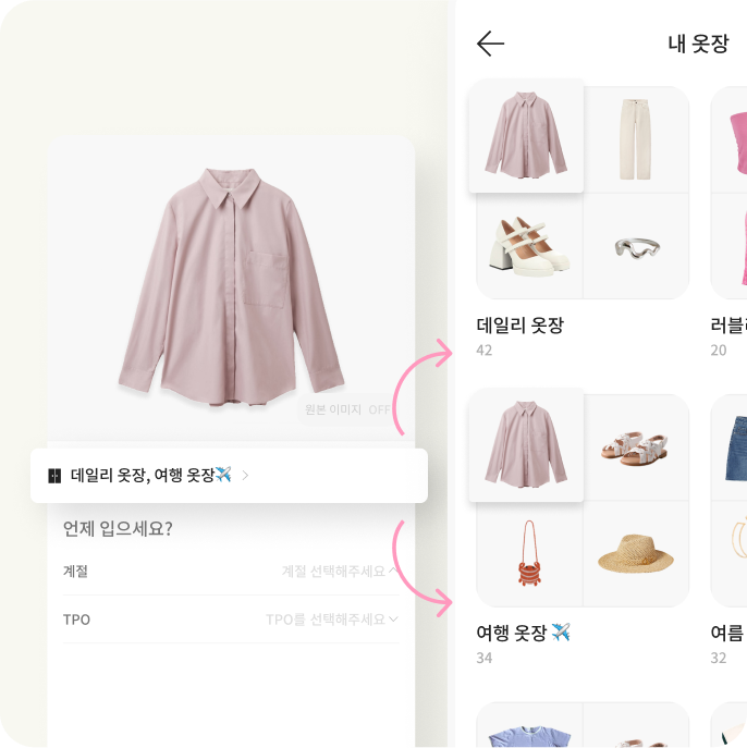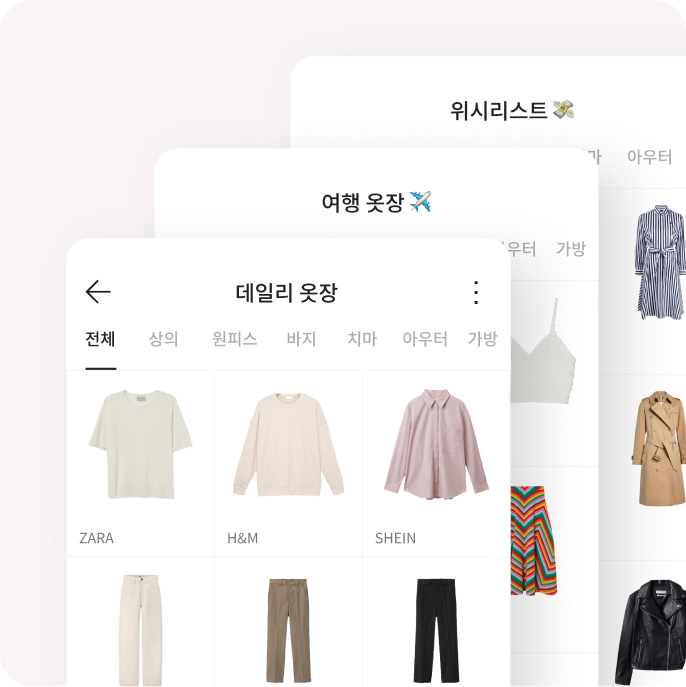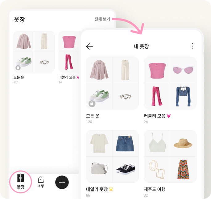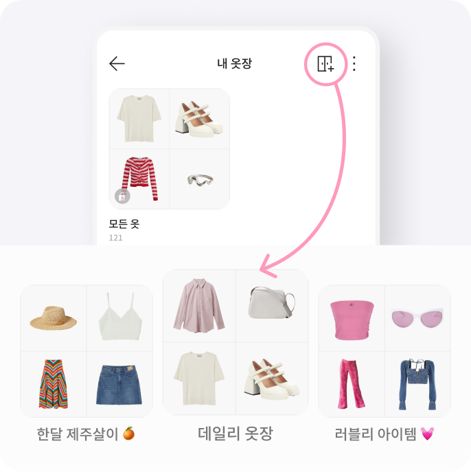 이제 옷장별로 원하는 대로 옷을 모아보세요