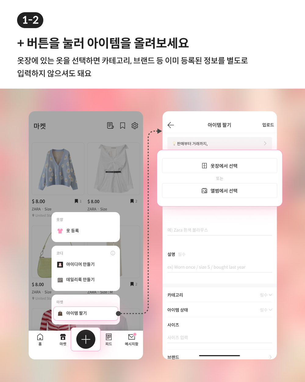 중고거래 기능에서는 “옷장”에서 옷을 불러와 매우 손쉽게 중고 판매 상품을 등록할 수 있도록 만들 예정입니다. 나에게는 잘 맞지 않는 옷을 다른 사람이 멋있게 입을 수 있도록 판매해보는 것은 어떨까요? 약간의 용돈도 벌 수 있고, 지속가능한 환경을 만드는 데에 일조할 수도 있을 것입니다.